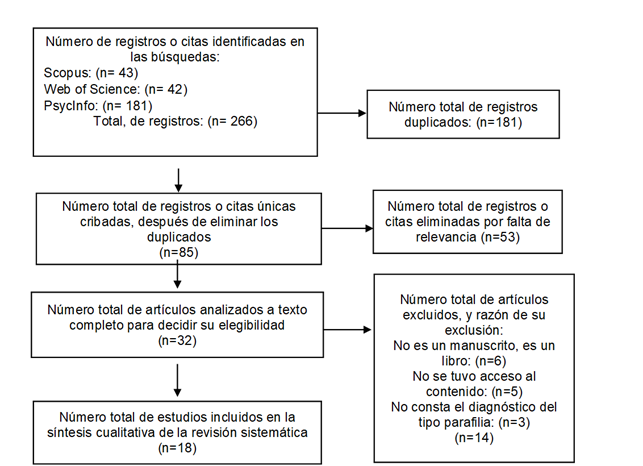 La búsqueda de artículos se realizó en plataformas y bases de datos como Scopus, Web of Science y PsycInfo. Los descriptores empleados bajo el método booleano de búsqueda fueron “criterios diagnósticos”, “parafilia”, “comportamiento sexual”, “delito sexual” e “intervenciones psicoterapéuticas”. Se consideraron aquellos artículos con impacto en los cuartiles desde Q1 a Q4, y se respetaron los siguientes criterios de inclusión: publicaciones científicas entre 2015-2022; investigaciones empíricas como estudios experimentales, cuasiexperimentales y ensayos clínicos, así como investigaciones teóricas como revisiones sistemáticas y metaanálisis por condensar criterios necesarios en esta investigación; y estudios que aborden la intervención psicoterapéutica de los trastornos parafílicos (TP) en áreas de investigación relacionadas con “parafilias” y “problemas del comportamiento sexual”.