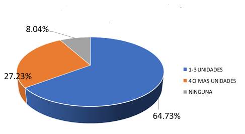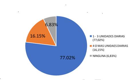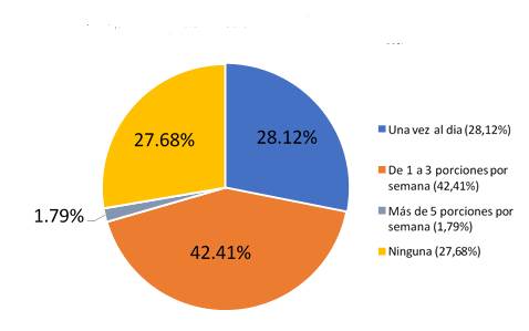 El análisis de la Figura 1, revela que el 64,73% de la muestra estudiantil, consume diariamente frutas y verduras, sin embargo, están por debajo del umbral que recomienda las Organización Mundial de Salud OMS (2018), quien recomienda un mínimo de cuatro raciones diarias. El 27,23% de los encuestados afirman consumir cuatro o más porciones al día, mientras que el 8,04% restante no incorpora frutas ni verduras en su dieta cotidiana.