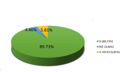 De la importancia de alimentación equilibrada sobre el rendimiento académico en estudiantes de bachillerato Figura 3, este señala que el 89,73% consideran indispensable una alimentación saludable y equilibrada para mejorar el rendimiento académico, mientras que el 4,46% expresó no creer en esta relación beneficiosa y el 5,81% indicó desconocimiento al respecto. A nivel general los datos se pueden interpretar como buenos, en la medida que la gran mayoría de jóvenes encuestados, conocen directa o indirectamente los múltiples beneficios que aporta una buena alimentación en el rendimiento académico. Estos datos vienen a corroborar la importancia que tienen los diversos nutrientes esenciales en el óptimo desempeño de la capacidad cognitiva, tal como lo sugiere Vilaplana (2016).