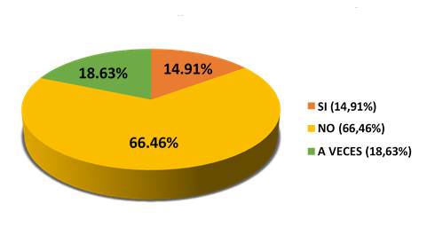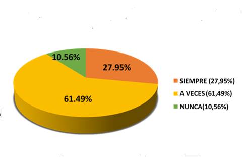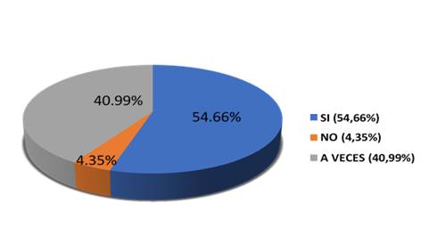 Si analizamos la importancia de la alimentación sana y equilibrada en el hogar de los estudiantes Figura 5, indican que el 54,66% de la población encuestada, manifiesta que la alimentación familiar es sana y equilibrada, el 40,99% considera que a veces y el 4,35% opina que no lo es. Estos datos obtenidos, arrojan luces y sombras sobre la situación alimentaria sana y saludable. La mitad de la población mantiene y desarrolla una alimentación sana y adecuada, la otra mitad no. Es importante incidir en la importancia y los beneficios que tiene una alimentación sana y equilibrada en los estudiantes, favorece el desarrollo cognitivo y activa los mecanismos de prevención contra las enfermedades. Según Martínez (2012), es crucial considerar la presentación visual de los alimentos, ya que influye en la aceptación de los mismos, especialmente en niños y jóvenes.