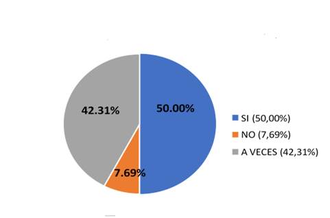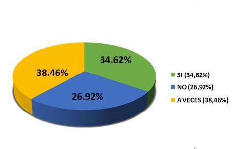 La finalidad de la pregunta es sondear el nivel de conocimientos que tienen los docentes, en relación al conocimiento de las leyes y las normas que promulga el estado en relación a la situación alimenticia en la población estudiantil. Se puede apreciar que el 42,31% mencionan que no ha recibido socialización sobre leyes y acuerdos alimentarios en el establecimiento educativo, por lo tanto, desconoce la normativa, por otro lado, el 38,46 % si ha recibido sociabilización en este tipo de programas, hecho que denota que tienen conocimiento del tema, por último, el 19,23% no saben del tema. Se observa que hay una variedad de experiencias entre los docentes, en relación con la socialización sobre leyes y acuerdos alimentarios, llama la atención la falta de coordinación de la dirección del centro con las entidades de gobierno, puesto que no hay articulación ni trabajo coordinado, tomando en cuenta la importancia que tiene precautelar la salud y el bienestar de los jóvenes, sobre todo en el ámbito educativo. Una nutrición saludable puede impactar positivamente el desarrollo del pensamiento crítico y creativo de los niños y adolescentes en edad escolar.
