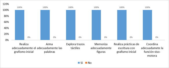 Este resultado está en línea con lo planteado por Calo e Iza (2023), quienes afirman que se han identificado carencias significativas en relación con la estructuración espacial y la escritura de grafismos iniciales en los alumnos. Según estos autores, estas deficiencias a menudo son atribuidas a que el 100% del profesorado desconoce actividades y juegos que contribuyen a mejorar la estructuración espacial, así como a favorecer el desarrollo de la lectoescritura y las habilidades gráficas en los niños. Es evidente que existe una necesidad de capacitar a los docentes en esta área, a fin de optimizar las metodologías de enseñanza y enriquecer el proceso de aprendizaje de los alumnos en sus primeras etapas formativas.