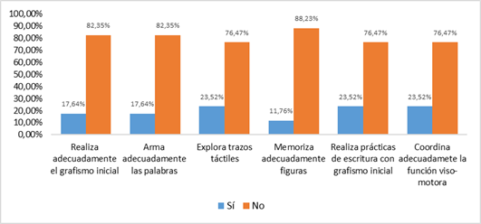 Realizar prácticas de escritura con grafismo inicial: En este caso, 76,47% de los estudiantes se encuentra en el nivel deficiente, mientras que un 23,53% muestra competencias suficientes, alcanzando el nivel medio. Coordinar adecuadamente la función visomotora: Los resultados reflejan que igualmente un 76,47% de los alumnos está en el nivel deficiente, dejando solamente un 23,53% en el nivel medio.