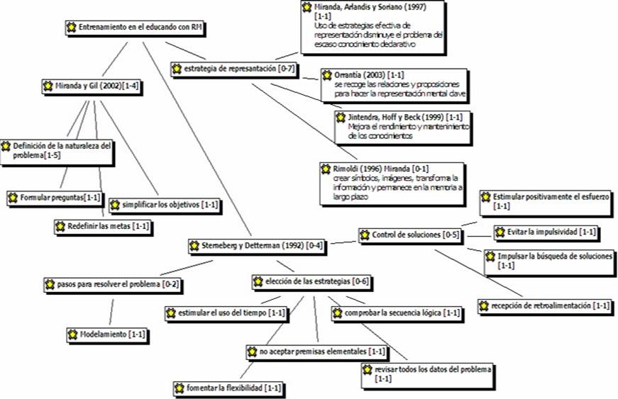 Miranda y Gil (2002), plantean que es importante resaltar que al estudiar las estrategias empleadas por los niños de temprana edad para resolver problemas, es indispensable observar los mapas que desarrollan en sus juegos. El descubrimiento o innovación son formas adecuadas de representación que facilita el progreso de las estructuras más complejas que requiere el proceso educativo. Podría afirmarse que la evolución del conocimiento requiere de representaciones mentales en el educando que faciliten la comprensión y apropiarse de un sistema de relaciones y operaciones que existen entre los componentes del problema que se intenta resolver. Jintendra, Hoff y Beck (1999) expresan que las técnicas de representación como los esquemas permiten una traducción efectiva o una interpretación de la información del texto median la resolución del problema. Al enseñar a los estudiantes a utilizar las representaciones para resolver problemas, su rendimiento y el mantenimiento de los conocimientos son mejores que los estudiantes que reciben instrucción básica a través de los libros de texto.