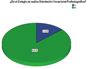 El 86,67% que equivale a 13 docentes, del total de la muestra, responden que no se realizan actividades de OVP en la institución educativa, contexto de este estudio, sin embargo el 13,33% indica que sí se realizan actividades para orientar la futura profesión de los estudiantes.