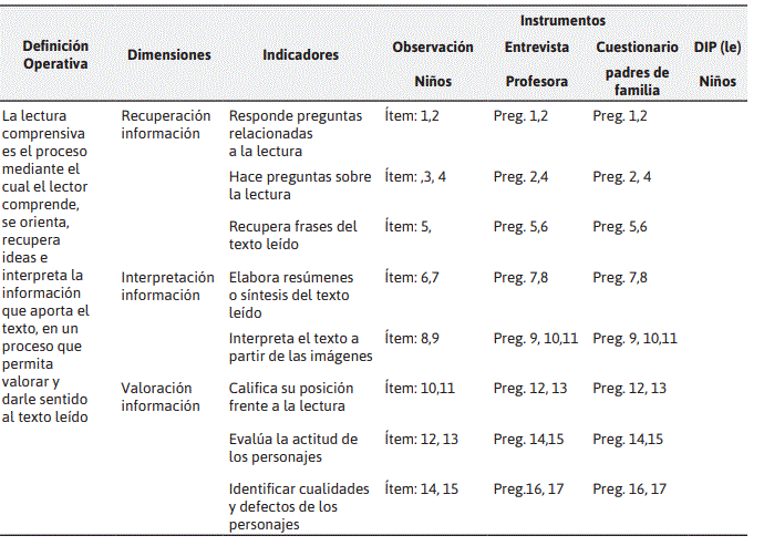 Las técnicas para la recolección de los datos fueron la observación no participativa, la entrevista y la encuesta. Los instrumentos estuvieron conformados por la guía de observación para la actividad de comprensión lectora de los estudiantes, la cual se aplicó durante 6 días por 30 minutos para un total de 180 minutos de observación. La guía de entrevista dirigida a la docente y el cuestionario para los padres de familia. Otro instrumento fue el Test DIP (le) (Di Scala y Cantú, 2011) para el diagnóstico psicopedagógico para la lectura y escritura, sólo se reporta el resultado de los ítems de la comprensión lectora.