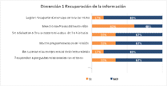 En la dimensión de la recuperación de la información el resultado fue positivo solo para la mención de pequeñas frases del texto leído, el 60% menciona frases el restante 40% no lo hace. El 83 % de los estudiantes no logran recuperar el mensaje central del texto; el 67% no hacen ni responden preguntas acerca de la lectura y no son capaces
