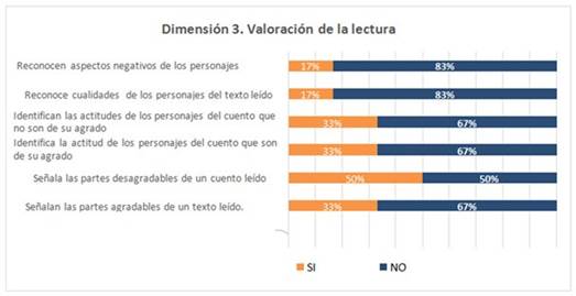 La dimensión 3 es la valoración de la lectura, tiene tres indicadores para calificar la posición ante a la lectura, evaluar la actitud de los personajes e identificar cualidades de los personajes, los resultados se pueden observar en el Gráfico 3.