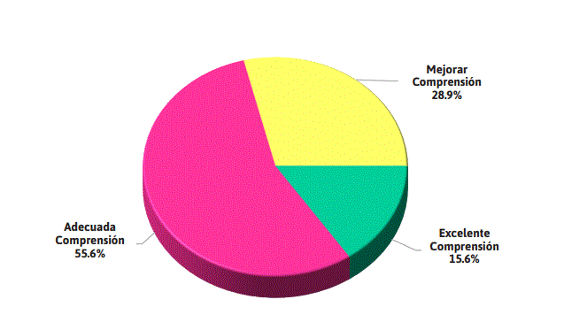 Por su parte, se observa en este Gráfico 2 que, el 55.6% refleja adecuada comprensión, el 15.6% manifiesta excelente comprensión, mientras que el 28.9%, lo cual indica que los estudiantes con altas capacidades en este factor entienden perfectamente cómo influirá su comportamiento en otras personas, mejorando así sus relaciones sociales, haciendo más empático su proceder cotidiano, permitiéndole esta habilidad mayor control de sus emociones ponderando su racionalidad para la comprensión de su entorno.