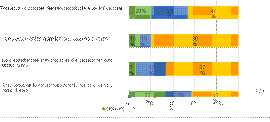 El ítem más significativo dentro de esta dimensión es el respeto hacia las emociones de sus compañeros, representa el 80% de la población. Resultan valiosos estos datos ya que si bien reconocer las emociones propias es algo importante, esto va acompañado de la expresión y el respeto que tengan los demás compañeros a lo que expresan. De nada sirve reconocer sus propias emociones y expresarlas acordemente si estas no son respetadas por los otros. Lo ideal sería esforzarse en paralelo para lograr el objetivo comunicacional deseado. (Gráfico 2).