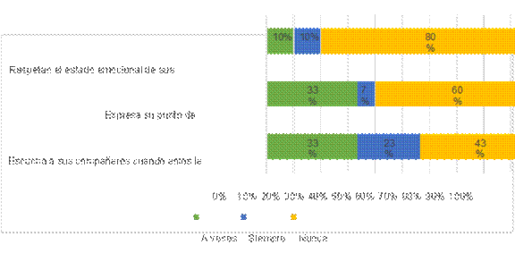 El hecho de que no puedan respetar esta acción evita que los adolescentes puedan dar su opinión respecto alguna situación. Se pudo evidenciar poco el ítem la colaboración entre compañeros, ya que dentro del aula existen grupos muy marcados y si la actividad dirigida a trabajar no fuese del grupo de pertenencia, se muestra bastante apatía e inclusive intolerancia entre los mismos. A esto se suma que dentro del mismo grupo de pertenencia existe desorganización, desencadenando una falta de ayuda y de cooperación entre pares.